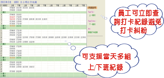 員工可即時查詢打卡歷程,以便和主管更正實際出勤狀況,避免勞資糾紛。 |